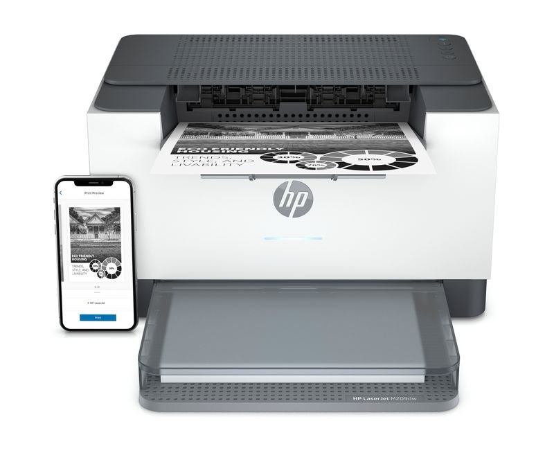 Tiskárna HP LaserJet Pro M209dw; Černá tonerová kazeta HP LaserJet (cca 700 stran); Protiprachový kryt; Referenční příručka, instalační leták, záruční příručka a list v některých zemích; Napájecí kabel