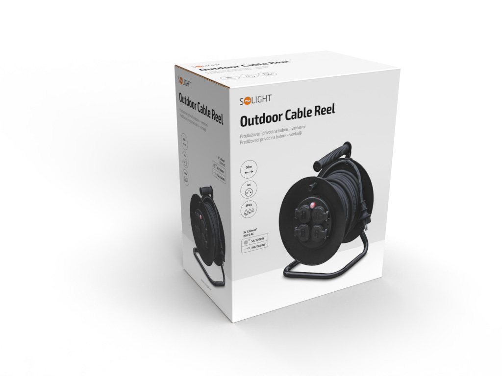 Solight prodlužovací přívod na bubnu, 4 zásuvky, venkovní, 50m gumový kabel, 3x 1,5mm2, IP44