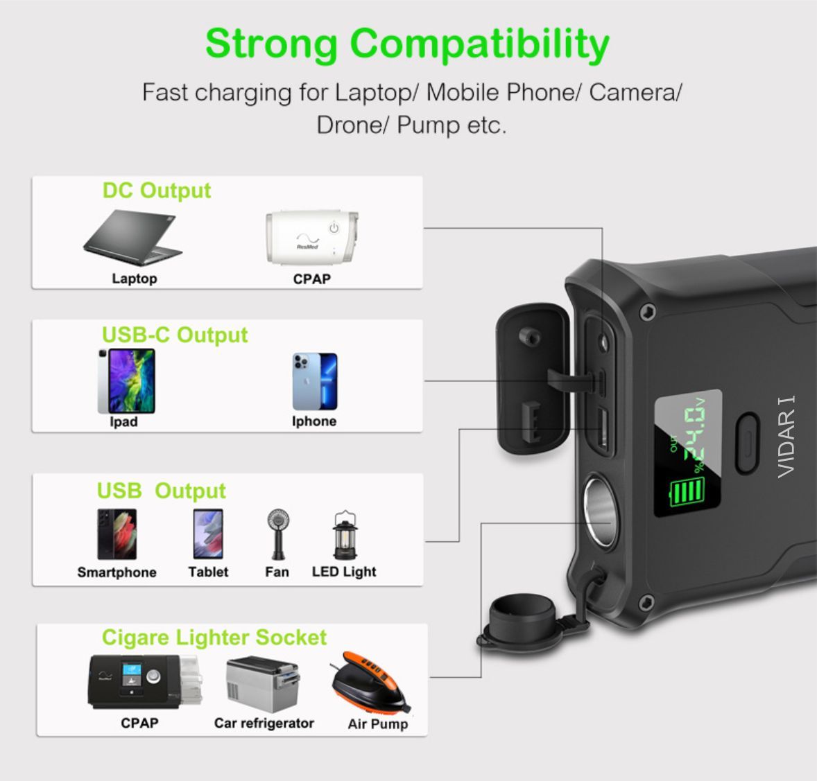 Viking VIDAR I je vybavena 4 výstupy, které Vám umožní nabíjet různá zařízení současně. Máte k dispozici USB-C a USB-A porty pro nabíjení chytrých telefonů, tabletů nebo jiných zařízení s USB rozhraním. Dále je zde DC jack pro přímé napájení například notebooků a cigaretová zásuvka pro nabíjení kompatibilních zařízení při jízdě autem. Tato široká paleta výstupů Vám poskytne potřebnou flexibilitu a možnost nabíjení více zařízení najednou.