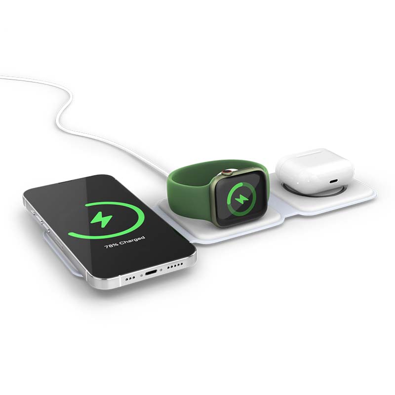Spello 3in1 Portable Wireless Charger je stylová nabíječka kompatibilní s MagSafe technologií. Je vyrobena z odolného silikonu a díky skládací konstrukci ji můžete mít kdykoliv po ruce. Nabíječka umí nabíjet až tři zařízení najednou. Svůj iPhone můžete nabíjet výkonem až 7,5 W, zatímco ostatní smartphony dosáhnou výkonu 15 W, dále nabijete Apple Watch výkonem 2,5 W a také AirPods o výkonu až 3 W. Praktický LED indikátor informuje o stavu nabíjení a díky vestavěným silným magnetům v nabíjecích plochách pro iPhone a Apple Watch, budou obě zařízení pevně umístěné na nabíjecí ploše. Součástí balení je i USB-C na USB-C kabel.