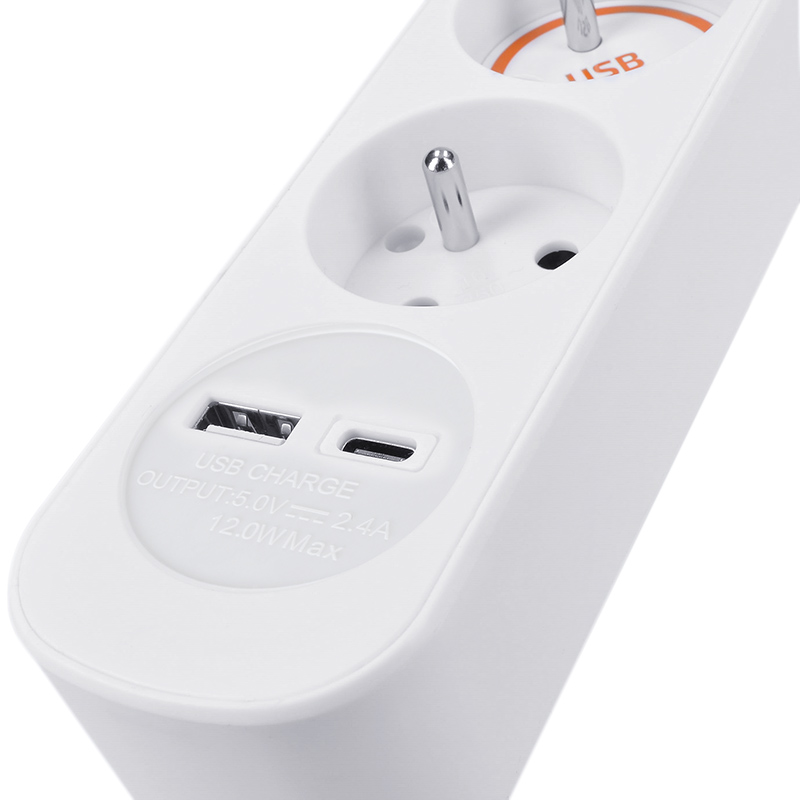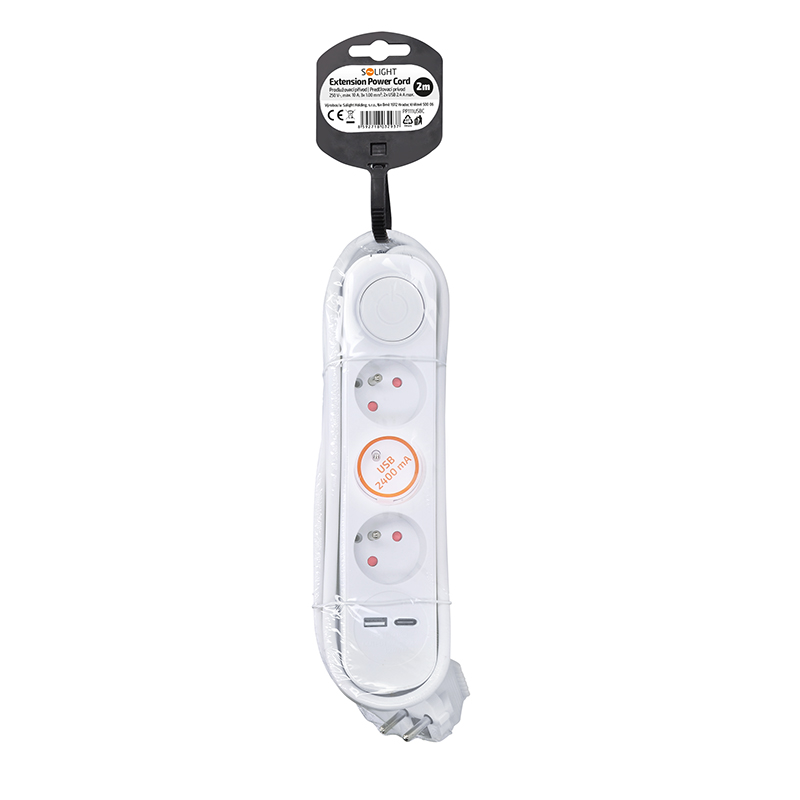 Solight 3z prodlužovací přívod s USB A+C nabíječkou 2.4A, 2m, 3 x 1mm2, bílý, vypínač