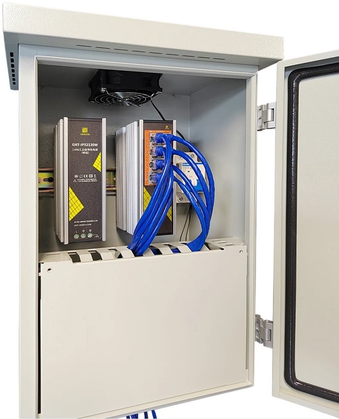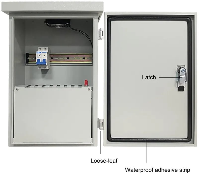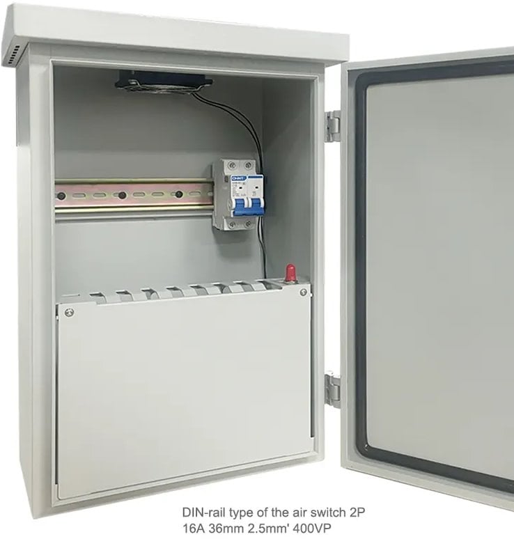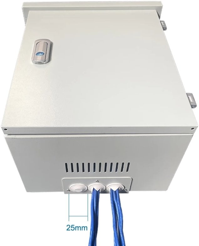 Krabice je vybavena aktivním chlazením (12V DC ventilátor) pro dostatečnou cirkulaci vzduchu a snížení teploty uvnitř rozvaděče. Vestavěná správa kabelů ve spodní části usnadňuje organizaci kabelů. Díky DIN liště uvnitř rozvaděče na zadní straně lze snadno instalovat elektrické prvky jako jsou AC/DC zdroje, routery, switche, EZS a jiné prvky. Univerzální vodotěsná krabice nabízí široké spektrum použití, zahrnující různé venkovní aplikace, jako jsou bezpečnostní a kontrolní systémy, s důrazem na spolehlivost a ochranu elektroniky.