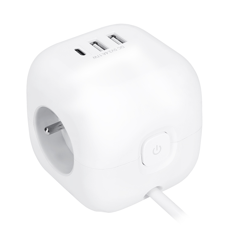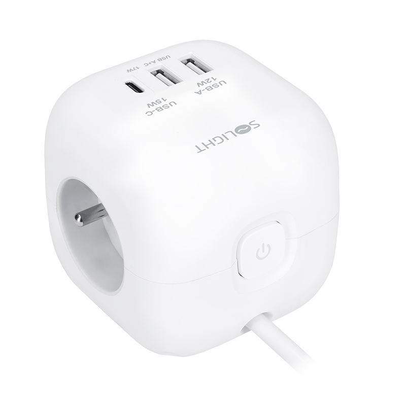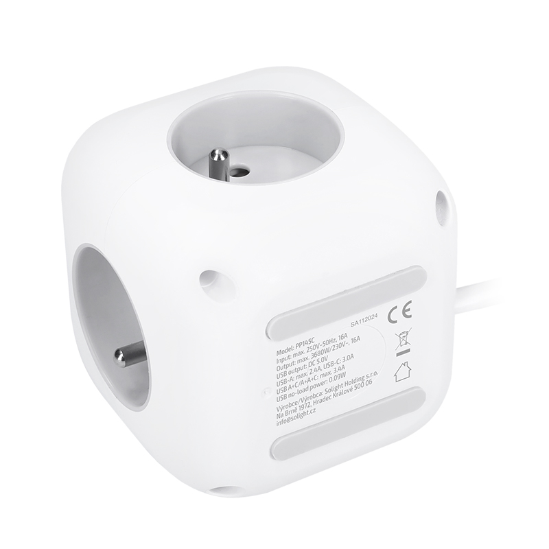 Prodlužovací přívod ve tvaru kostky s délkou strany 8 cm spojuje tři uzemněné zásuvky s dětskou pojistkou a USB nabíječku s porty USB-C a USB-A. Díky 2m dlouhému kabelu poskytuje flexibilní využití. Protiskluzové podložky udržují přívod stabilní na stole nebo pracovní ploše. Podsvětlený vypínač umožňuje snadné ovládání všech zásuvek i USB portů.