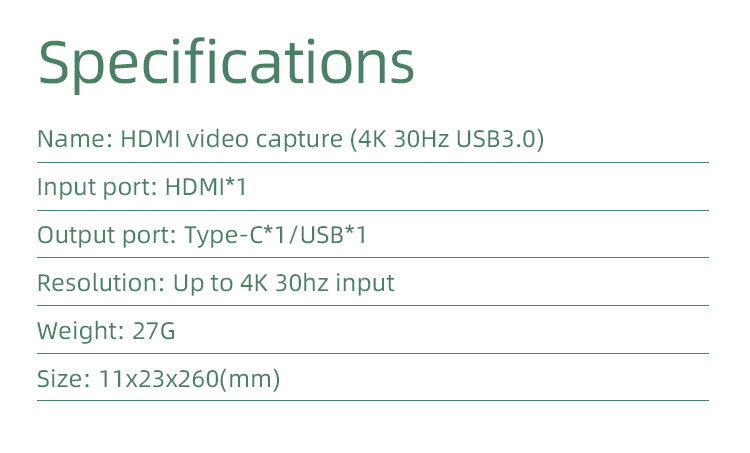 - Vysoké rozlišení nahrávání FULL HD 1080P při 60Hz, podporuje maximální vstupní rozlišení 3840 × 2160 při 30 Hz, maximální výstupní rozlišení FULL HD 1920 × 1080 při 60 Hz.